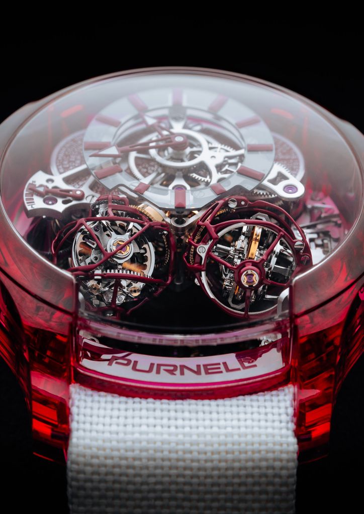 The Purnell Escape II Unique Absolute Sapphire “Hancock Red” continues the collection, now with red diamonds. It features a domed top crystal sapphire perpendicular at 6 o’clock.