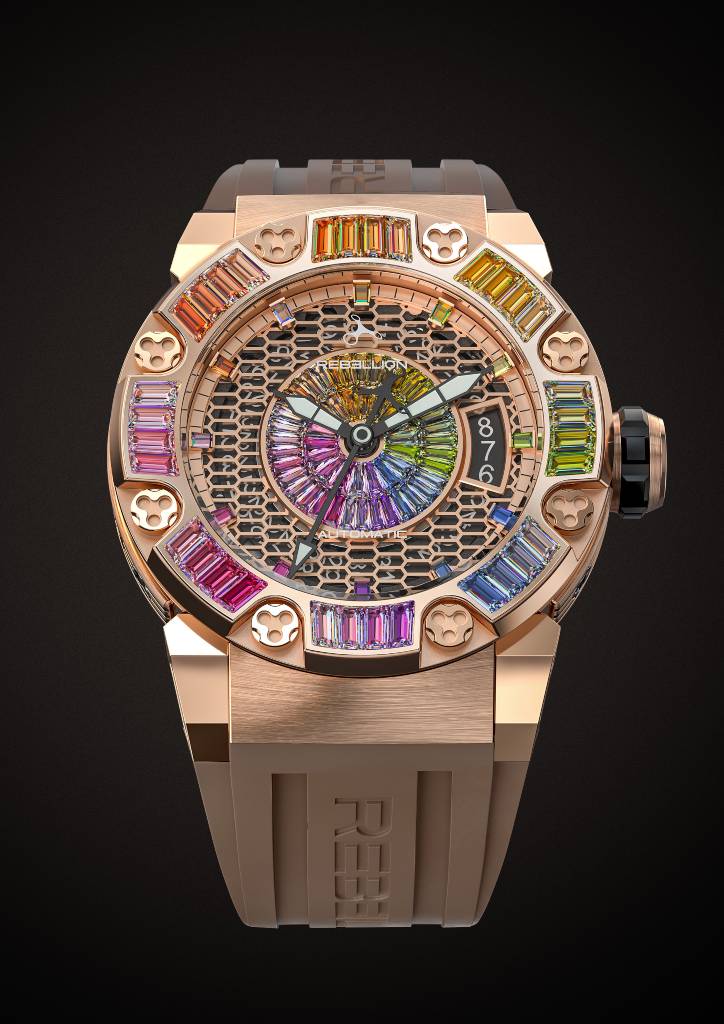 The Rebellion Timepieces Predator S Rainbow Inner Spectrum is multicolored with 102 baguette-cut sapphires to complete its bezel and dial. The sapphires contrast with the case made in rose gold with the hour and minute hands further coated in luminescent material.