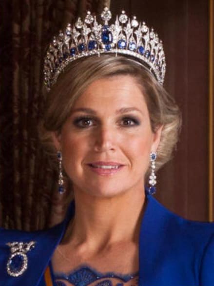 The Dutch Sapphire Tiara has 655 South African diamonds embedded in platinum, with 33 sapphires at the bottom of the diadem. Some of the stones are set on flexible springs, fiving the impression of movement and an increased amount of shine. Bought in 1881 by King Willem III of the Netherlands for his wife, Queen Emma, it was next worn by her granddaughter Queen Juliana, and then by the next queen, Queen Beatrix, whose hair was so large it could’ve been mistaken for purely a diamond tiara with one large sapphire in the middle. The set included a necklace that has been turned into a tiara, that both Queen Beatrix’s daughter-in-laws wore, until one of them became queen. Queen Maxima wore the tiara for her husband King Willem-Alexander’s coronation and changed the center portion, while wearing her hair in a more taimed manner to show off the sapphire base.