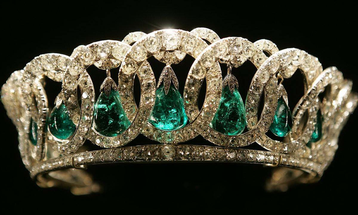 The Grand Duchess Vladimir (Maria Pavlovna, wife of Grand Duke Vladimir Alexandrovich) was the aunt of the last Tsar of Russia, Tsar Nicholas II (murdered in cold blood by the Bolsheviks in 1918). The grandest of the grand duchesses of Russia, her wonderous jewelry collection included this tiara with intertwined diamond circles tied together with a diamond ribbon, and which hung pendant pearls. When the Russian Revolution struck, she hid the piece (along with the rest of her collection) in the vaults of the Vladimir Palace before she fled St. Petersburg, until it was smuggled out by the British Secret Intelligence Secret Service in a plain bag. When it was returned to her, she gave it to her daughter Princess Nicholas of Greece, who sold it in 1921 to Queen Mary, and it was inherited by Queen Elizabeth II. The most versatille piece in the Queen’s tiara collection, it can be customized with emeralds, swinging pearls, or worn plainly.