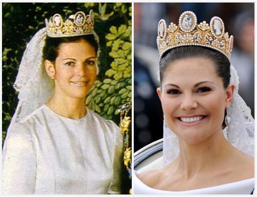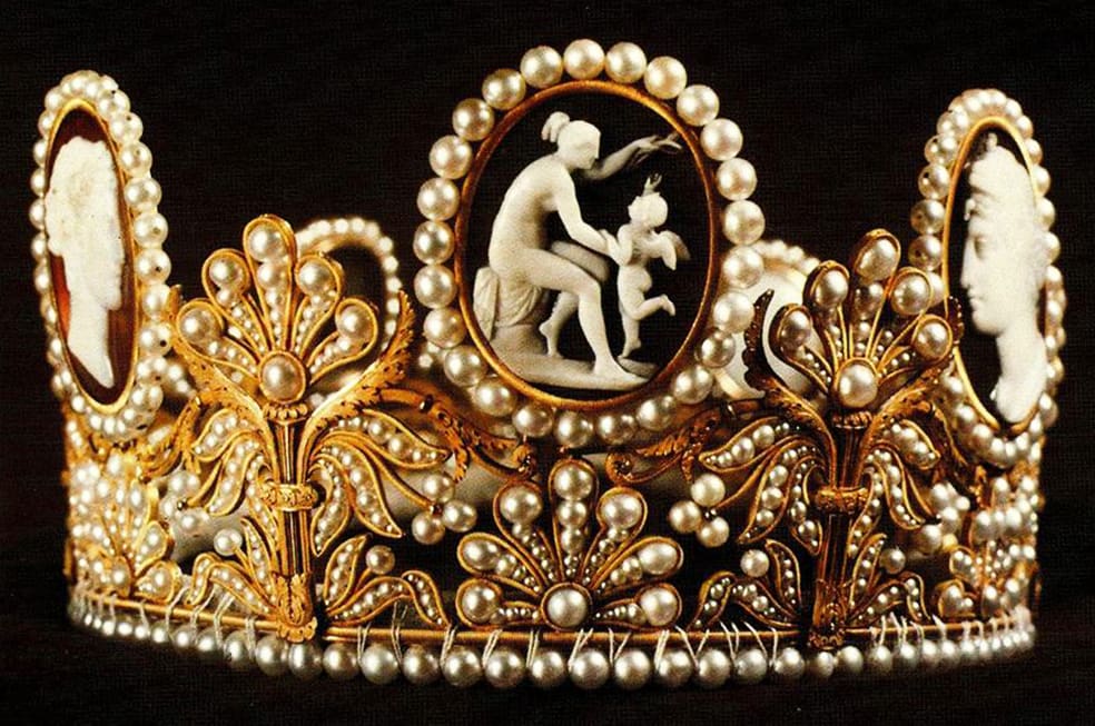 A gift from Empress Josephine sometime during 1809, this tiara is very much of its time. The cameo pieces were never intended to be be paired with each other, which explains the differing sizes and colors. It ended up with the Swedish Royal Family after Josephine’s granddaughter, Josephine of Leuchtenberg brought it with her for her marriage to the future King Oscar I of Sweden and Norway. She left it with her daughter Princess Eugenie, who gave ite to her nephew Prince Eugen, who then lent it to Crown Princess Margaret, his niece by marriage, before eventually handing it over to Princess Sibylla of Saxe-Couberg Gotha when she wed Prince Gustaf Adolf in 1932. Princess Sibylla loaned it to her sister-in-law, the fiture Queen Ingrid of Denmark, before finally leaving it to her son, the current King Carl Gustaf. In that time period, it became the official Swedish wedding tiara; first used by King Carl Gustaf’s sisters for their weddings, and when he married his wife, Queen Silvia. The next to use it at her wedding was Crown Princess Victoria in 2010.