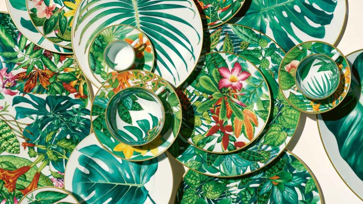 The 184-year-old French brand features bold lines and depth of color in its porcelain tableware collections. The decorative details of each piece are handmade using chromolithography, a method of producing an original print in every production. There are currently 14 lines to choose from, and every set has a story behind it. For instance, the tropical Passifolia set is a homage to the foliage that adorns nature. While the blue, white, and black palette of the Blues D’Ailleurs collection takes inspiration from travel imagery between Europe and Asia.