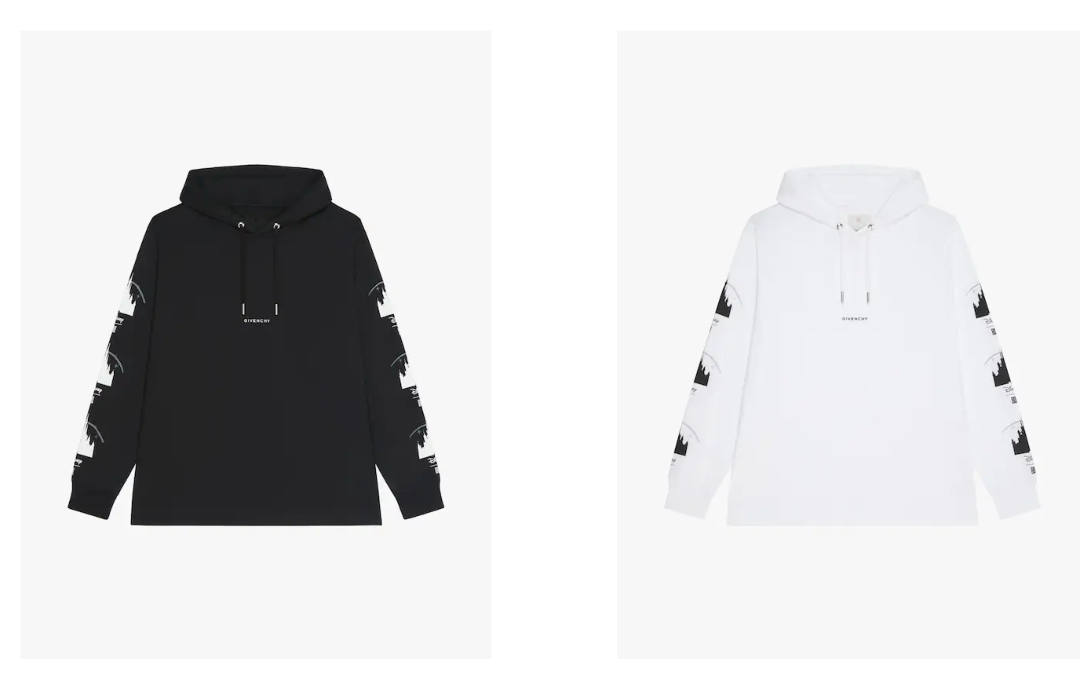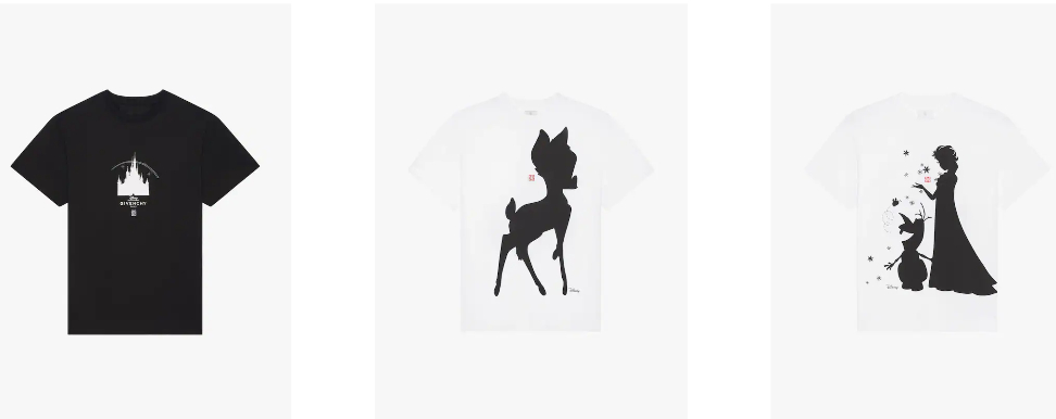 The seven minimalist pieces, with only the characters and Disney’s Cinderella Castle’s silhouettes on t-shirts and hoodies, are now available on Givenchy’s website.