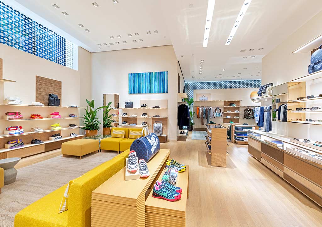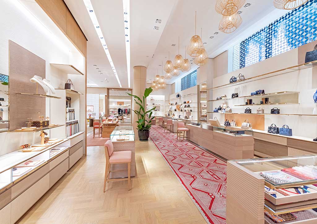 A destination in itself, the store welcomed its first guests into a breezy tropical cabana, with the House’s codes subtly integrated into the glass panels surrounding the store.