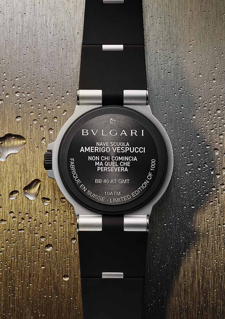 The titanium caseback bears the signature “Nave Scuola Amerigo Vespucci” and its engraved motto. The articulated rubber strap, a characteristic element of the Bulgari Aluminium models, meets the dual requirement of robustness and flexibility while enabling all kinds of audacity in this watch intended for natural-born explorers.