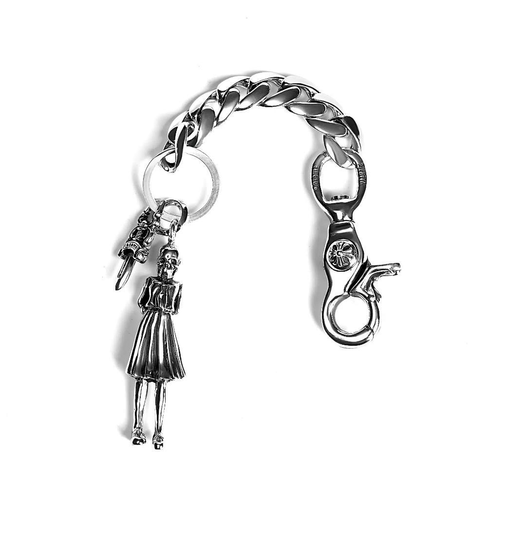 Decorate your bag with an attention-grabbing key chain. The Chrome Hearts 9 Link Key Chain With Foti Skippy and Dagger Key Ring will perfectly accentuate your bag’s charm. Made from the famous Chrome Hearts 925 sterling silver, it is a classic yet edgy take on accessorizing your bag.