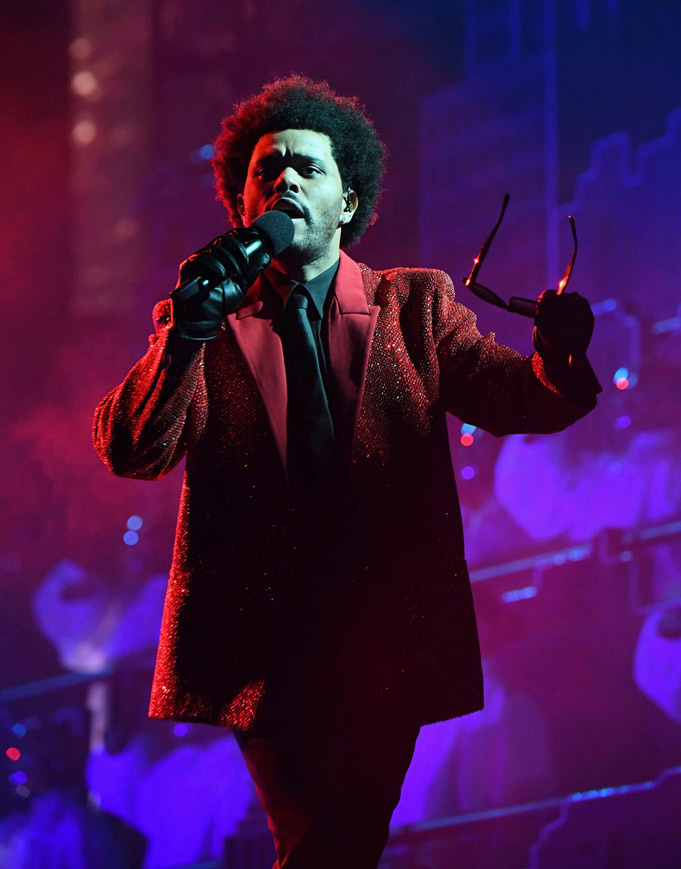 During his 14-minute set, he took on such hits such as “Star Boy” and “Can’t Feel My Face” from the stands before moving on to the field for “Blinding Lights.” All throughout, he had on a fully hand-embroidered jacket filled with crystals, which shimmered every so often as lights streaked around the 65,000-capacity stadium.