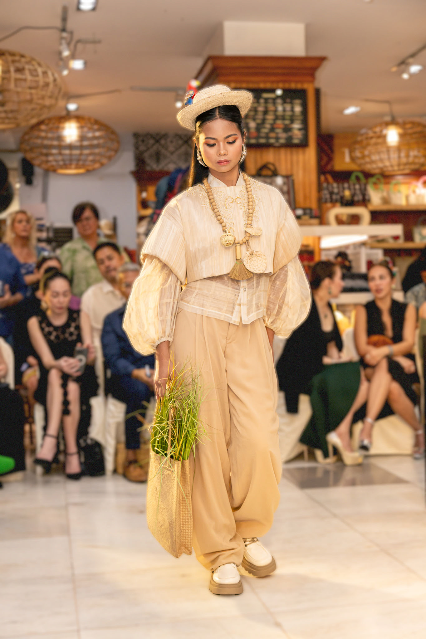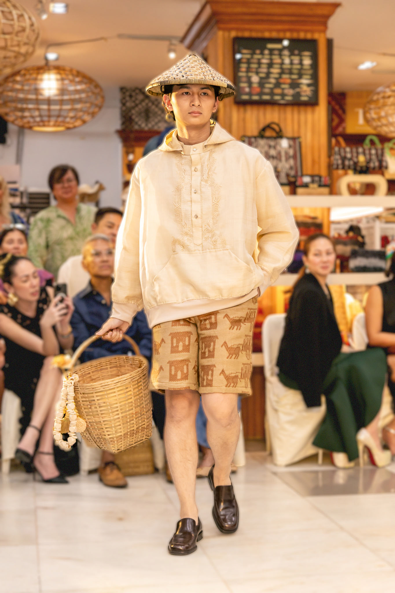 The collection features cropped tops with various sleeve styles, blazers, jackets with detachable hoods, and traditional Filipino silhouettes reimagined in an oversized style. Each piece is crafted from traditional Filipino fabrics, emphasizing the importance of honoring local craftsmanship.