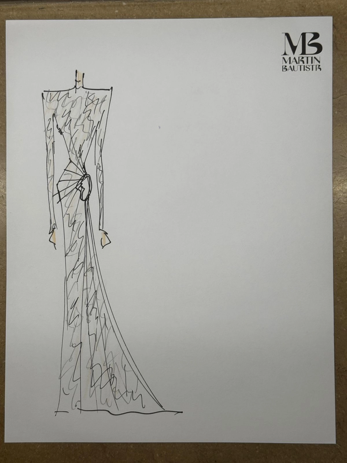 “We approached Martin Bautista with a prayer and a dream,” Carla recalls. An original plan to pull an existing look from his collection was thwarted when the piece had already been sold. What followed was a custom couture solution. “With this incredible vintage lace fabric he had been saving in his archive, and a quick mannequin drape to test, the dress immediately manifested into exactly what we needed.”