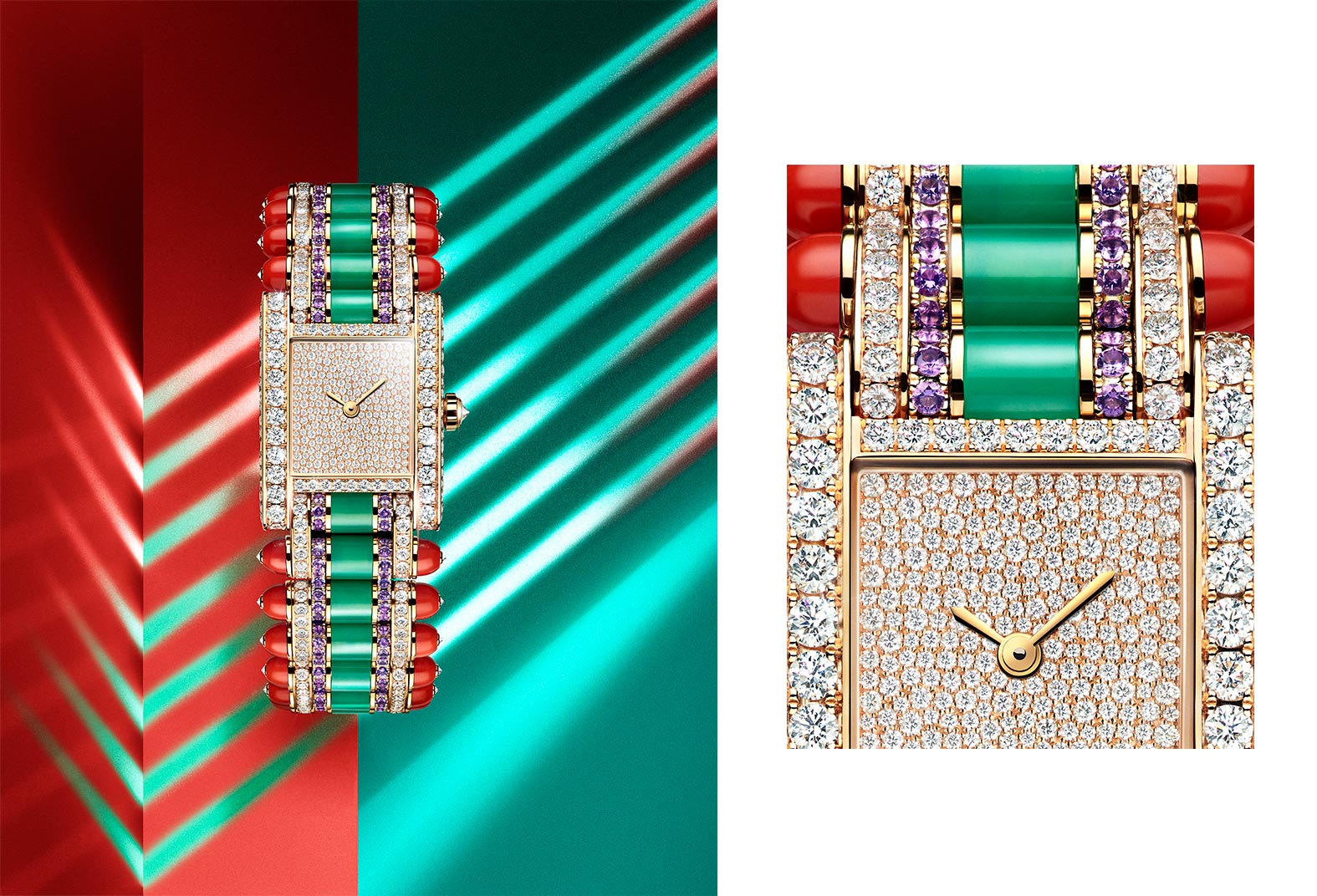 Its bejeweled variation, the Jewelled Tank, has the same sleek, rectangular shape, but is characterized by intricate diamond detailing. However, the watch’s beauty is not limited to its masterly detailing alone. For the new Tank watch, Cartier revived a color palette borrowed from Jeanne Toussaint: black, like the onyx of the cylinders, the edge, and the dial. This contrasts with the acid green of the chrysoprase beads and the red of the rubies set along the vertical brancards, as well as the nails at the end of the chrysoprase cabochons.