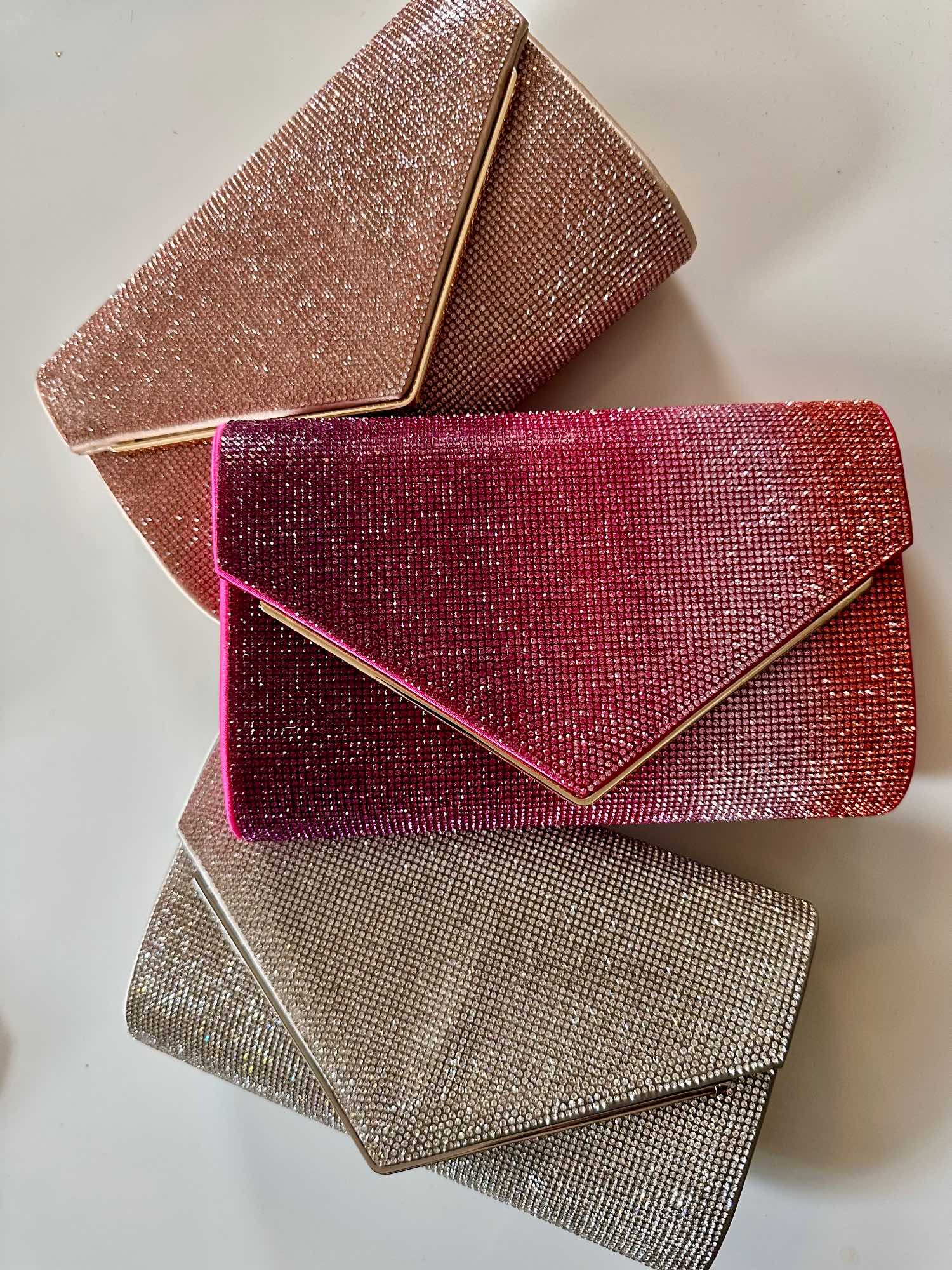 The Candy Envelope Clutch in Champagne, Fuchsia/Orange Ombré, Silver, and Gold/Bronze Ombré / Photos courtesy of Rafè New York