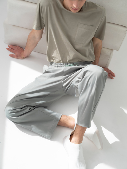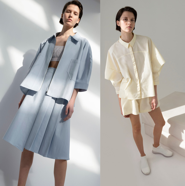 The same approach is used for Harlan + Holden’s new men’s and women’s pieces. One-step dressing is reflected in new elasticated details on the collection’s shirts, dresses, shorts, trouser waists, and jacket back panels.