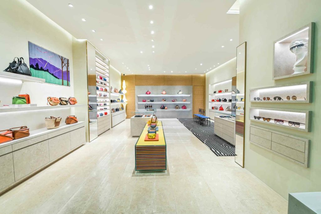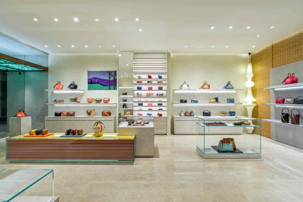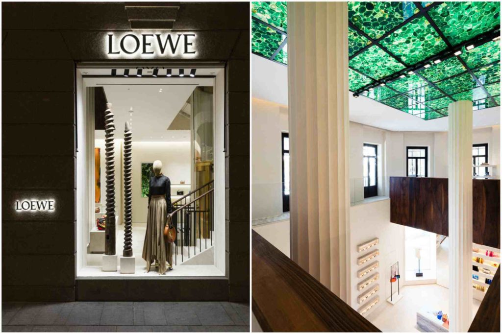 The exterior of the Shangri-La store features translucent green stones that make up a beautiful emerald green canopy. Inside, modern and traditional artworks decorate the spaces. These include a tapestry woven by Master Weaver and Textile Designer John Allen. There are other works from Fall/Winter 2018 stools and chairs, and Japanese-American artist Isamu Noguchi’s Akari E Light sculpture add a modern edge to the store. These designs and artworks echo the brand’s identity. LOEWE shows simplicity and elegance by marrying modern and antique styles in their stores and products.