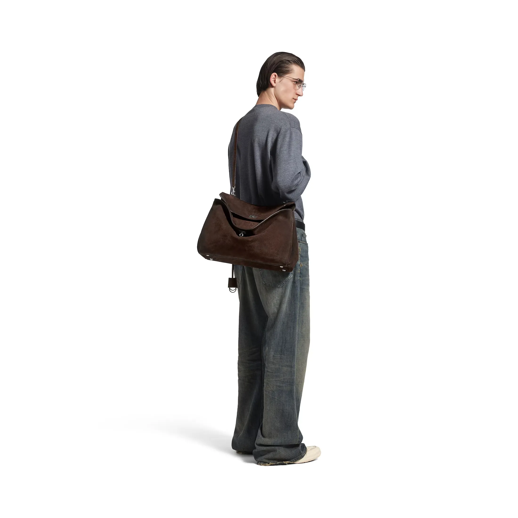This Rodeo isn’t a cowboy’s saddle bag—it’s Balenciaga’s slouchy yet sculpted with smooth calfskin accents and aged-silver hardware interpretation. It’s roomy enough for your laptop, lipstick, and whatever mood playlist you’re currently obsessing over. With a turn-lock closure, removable shoulder strap, and a cool front pocket, it’s like the bag version of your effortlessly edgy friend who always knows what’s up.
