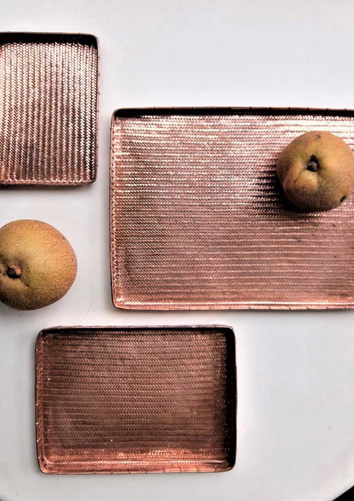 Since then, Mark has taken the distinctive weave to different directions. It’s found in the trays, “woven in 26 gauge copper and terminated with the ‘bilao’ edge,” the small family of lamps, as well as the accent table series.