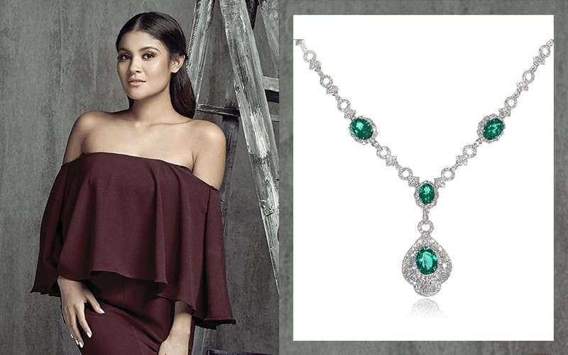 This stunning green emerald necklace with diamonds matches Kiana’s free-spirited yet elegant personality. She can definitely pull off this statement piece.