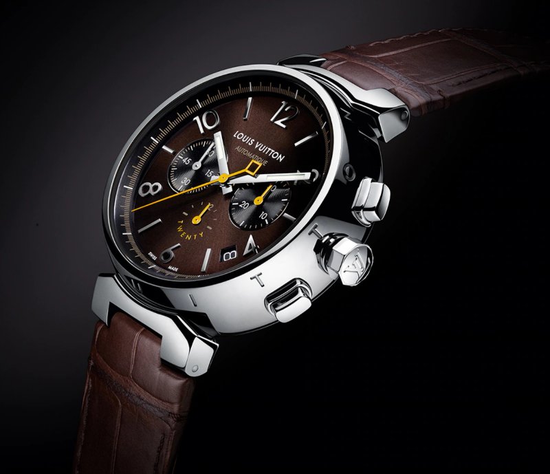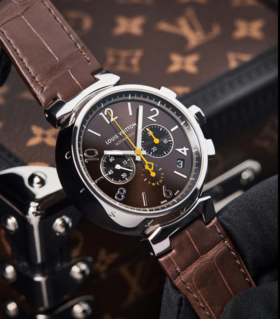 It includes a deep, flared 41.5mm case with a brown sunray dial, yellow chronograph hands, and the engraved brand name flanking the case. However, the design update includes the LV277 high-frequency automatic chronograph movement, a 22-carat oscillating weight, and an engraved case back. Only 200 pieces of the newest Tambour will be released, which come in a custom trunk made from monogram canvas.