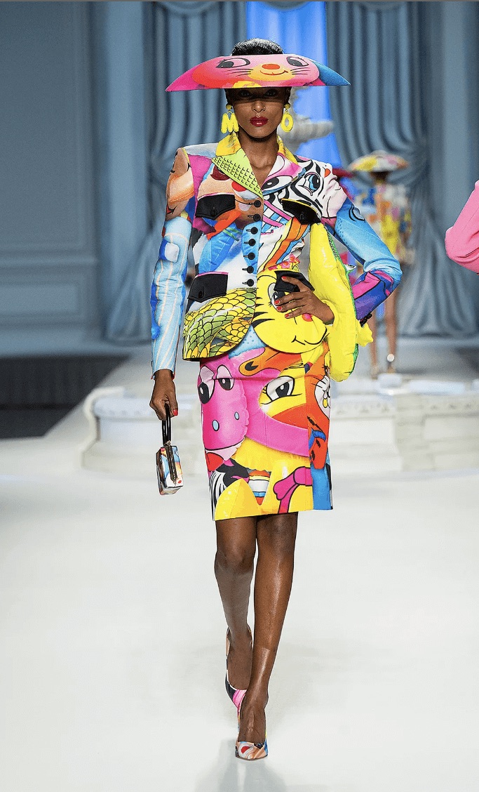 Another brand known for severe maximalism is Moschino. The brand is not afraid to play with bold colors and extreme patterns and silhouettes which is a design signature. In the recent Spring/Summer 2023, Moschino paraded whimsical dresses with colorful patterns, depicting a pool floater.