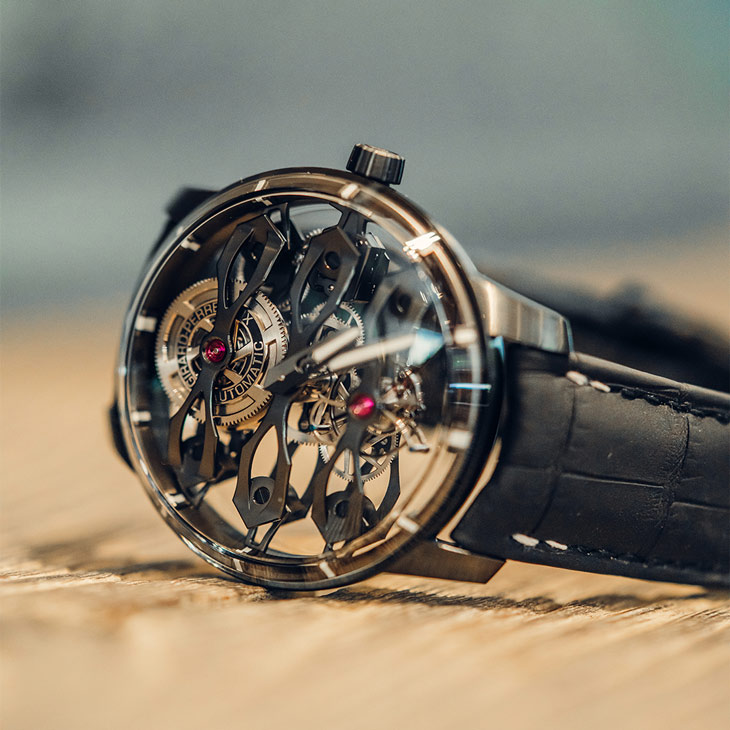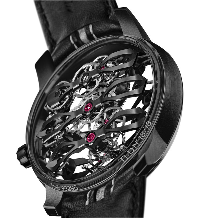 Three bridges, which is a signature of the Swiss watchmaker, span the dial and are formed of titanium with black Physical Vapour Deposition treatment and polished angles. The case’s open design also confidently allows a view of the piece’s engineering and movement.