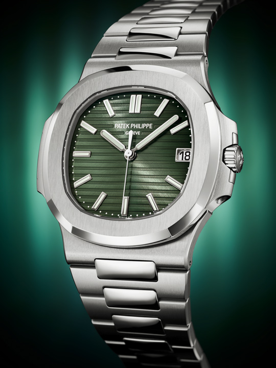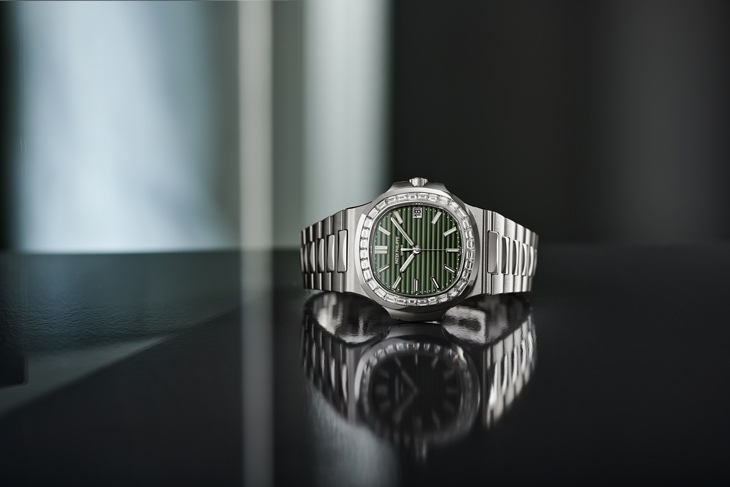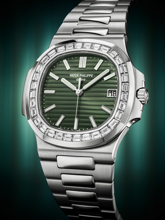 Following the announcement that 2021 will be the last production year of the stainless steel model Ref. 5711/1A, Patek Philippe presents a new olive green sunburst dial. This new dial will also be available in a version featuring a bezel set with baguette diamonds. The Ref. 5990/1 Nautilus Travel Time Chronograph comes in rose gold with a blue sunburst dial while a new Nautilus Haute Joaillerie with a random full diamond pavé setting also debuts.