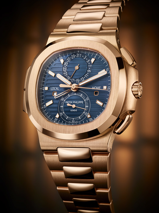 Apart from the models with three hands and a date, the Nautilus collection also includes five complicated timepieces which combine sports appeal with technical finesse: The Ref. 5712 with an analog date, moon phases and a power-reserve indicator; the Ref. 5980 with a flyback chronograph and automatic winding; the Ref. 5726 with a patented Annual Calendar, 24-hour display, and moon phases; the Ref. 5990 Nautilus Travel Time Chronograph with two time zones, a flyback chronograph, and an analog date; and the Ref. 5740 Nautilus with a perpetual calendar.