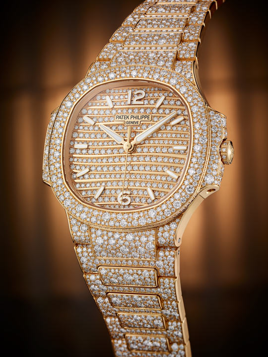 The ladies’ Nautilus watches come in various haute joaillerie versions set with brilliant-cut or baguette diamonds. From 2013 to 2018, Patek Philippe offered a rose-gold model that was adorned with diamonds in a random pavé (or snow) setting.