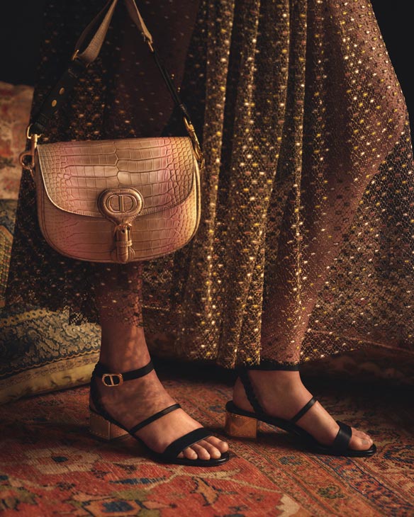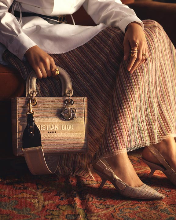 The brand shows off its atelier’s virtuoso craftsmanship in the capsule’s accessories, particularly with the bags. From the Dior Book Tote (also available as a mini) to the Lady Dior to the Dior Caro, these revisited classics are all finely embroidered with metallic threads.
