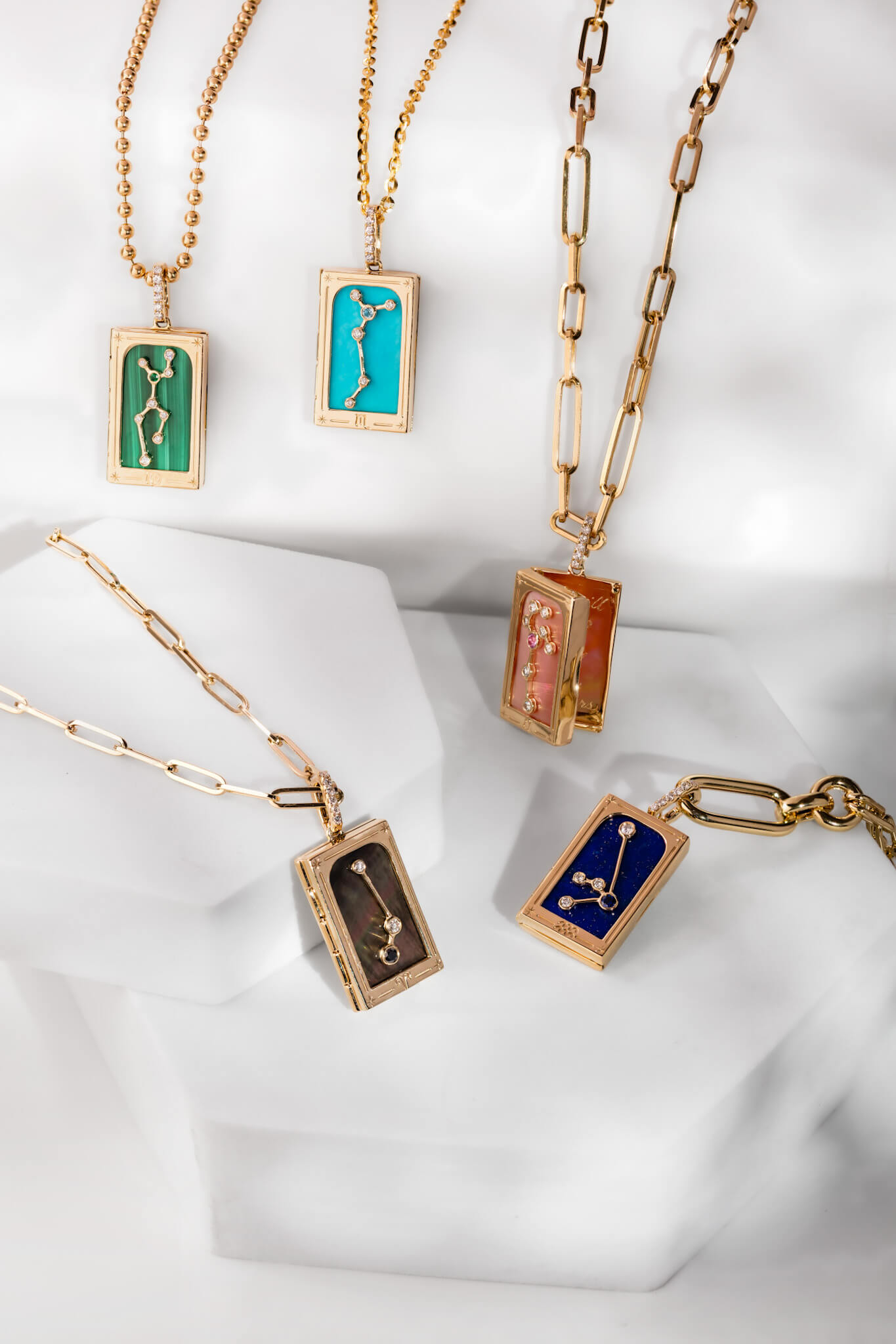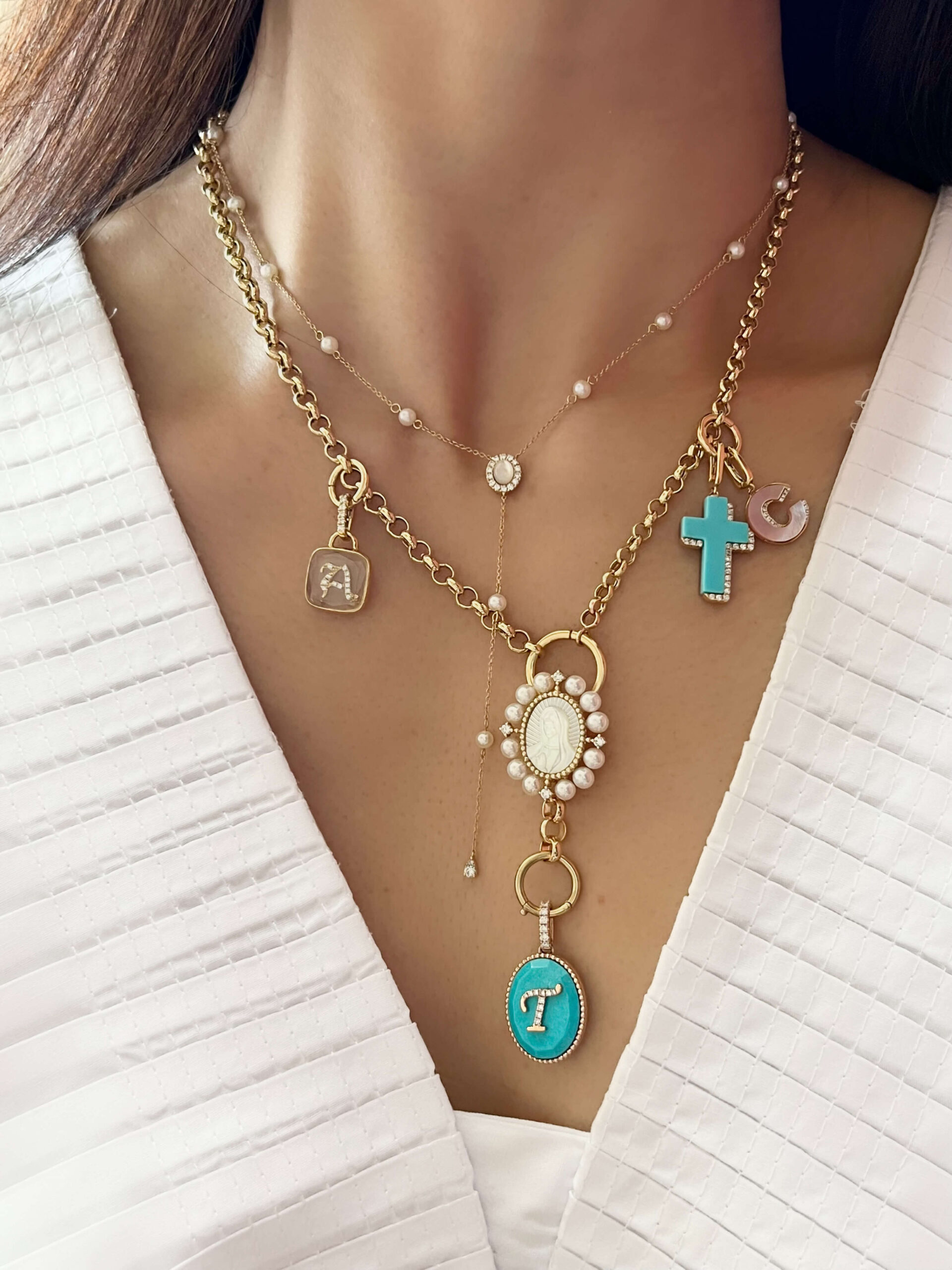 Kristine Dee’s precious jewels are likewise conversation starters, made even more memorable when personalized with one’s initials. Diamond letters and symbols adorn her pendants, crafted out of quartz, rose quartz, lapis lazuli, malachite and turquoise. Celestial symbols are yet another fountain of inspiration, resulting in pendants decorated with one’s zodiac sign. The stylish jeweler also loves layering her necklaces and bracelets, interspersing her charms with pearl and diamond strands to amazing effect.