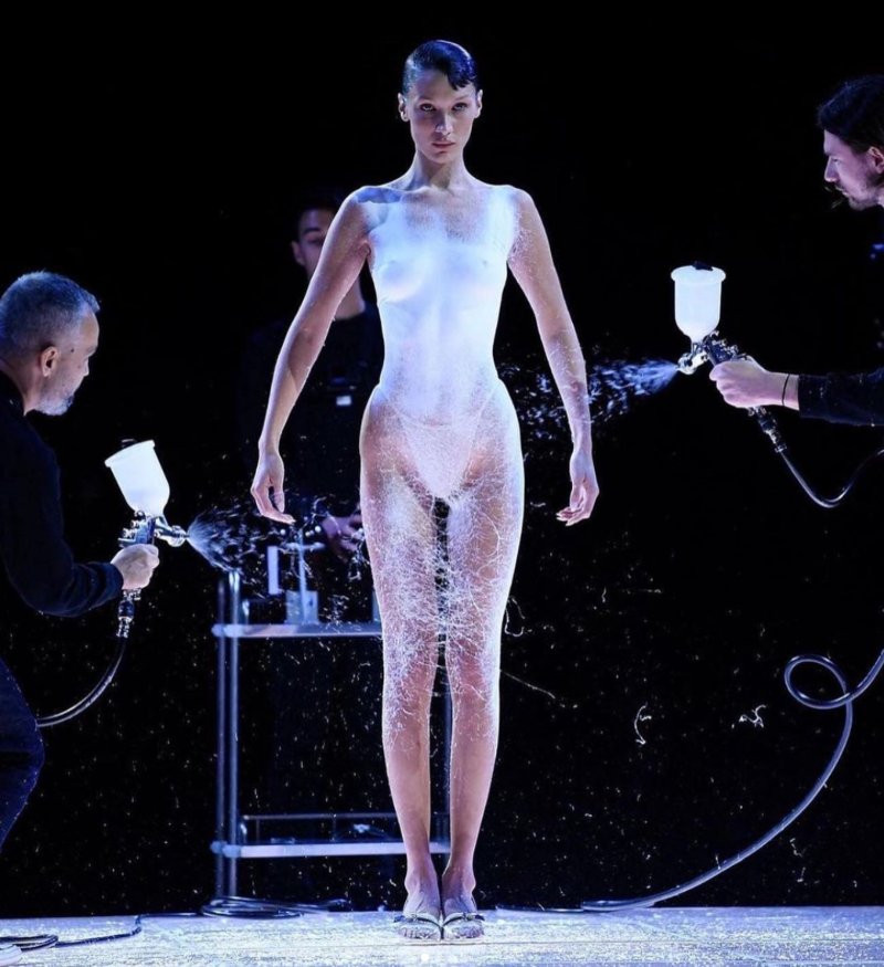 That’s when the piece of performance art began. While standing still, Hadid was sprayed with a liquid containing cotton or synthetic fibers. According to Vogue Business, the technique was developed by Fabrican, founded by Spanish fashion designer and scientist Manel Torres. After a few minutes, the model was fully clothed in the Fabrican liquid, which transformed into a below-the-knee dress. It was then cut up to create an off-shoulder and leg slit detail. It took six months to develop the liquid formula.
