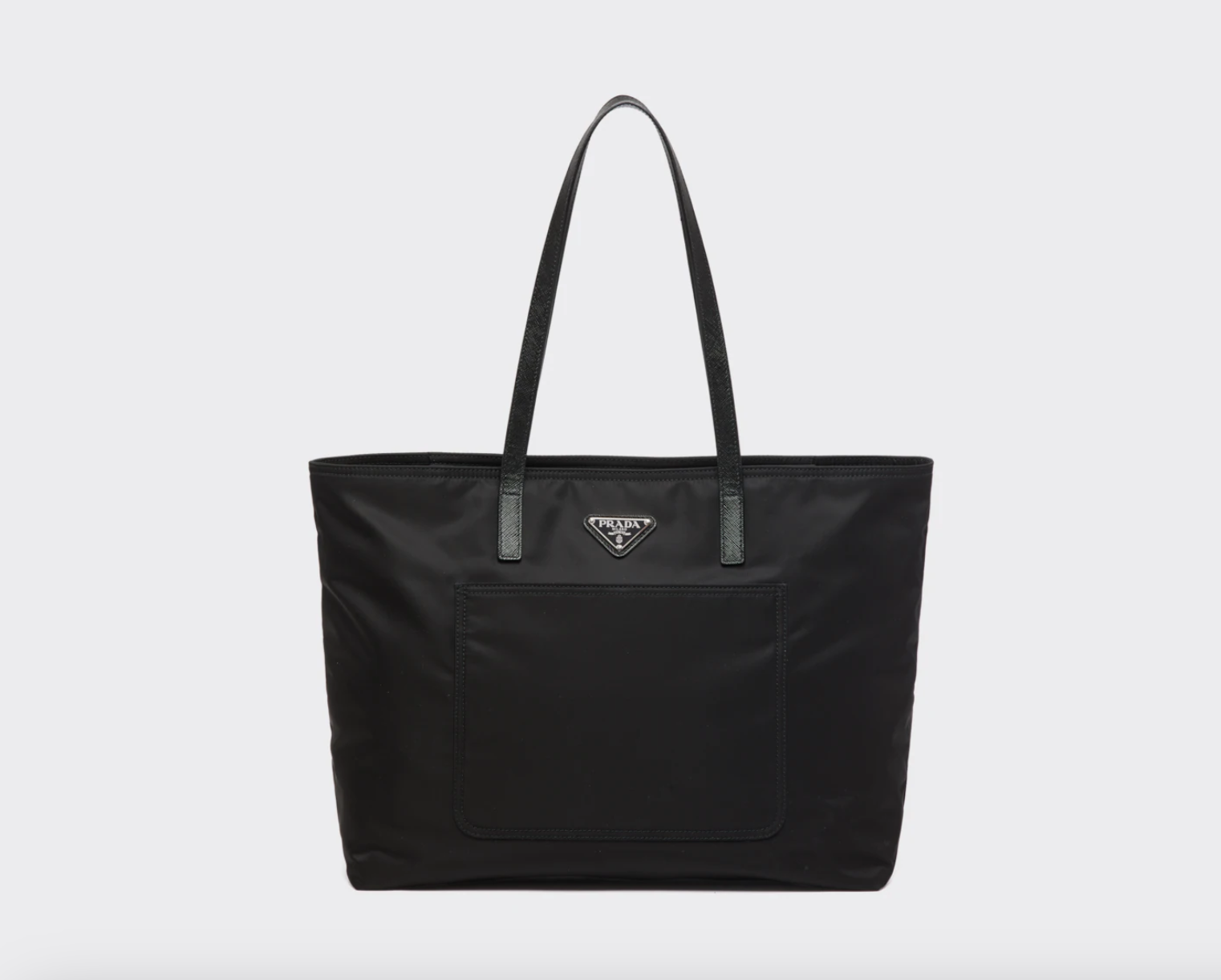 A roomy front pocket stands out on this tote bag with a classic design, accented with Saffiano leather handles and decorated with the distinctive triangle logo.
