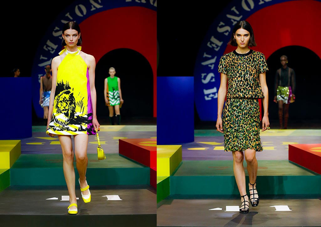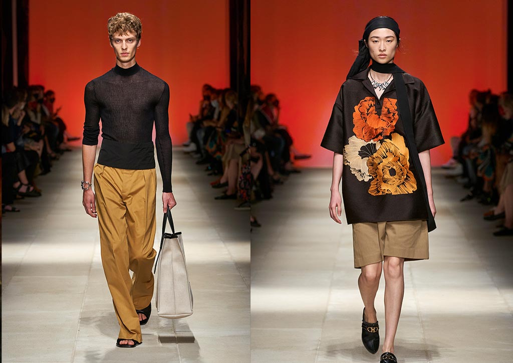 The brand went through its archives in search of worn stereotypes to transform, such as tiger print. An example of this is the collaboration with Parisian artist Julien Colombier that sees a repurposed 1970s Ferragamo floral foulard overprinted on a loose-yarn tiger-stripe jacquard, or fully embroidered using an old and typically Italian technique. Impactfully colored separates in knitand jersey, sometimes fringed, are worn with freedom. Tactile, textured fabrications combine cotton and silk, wool and linen, and hemp.
