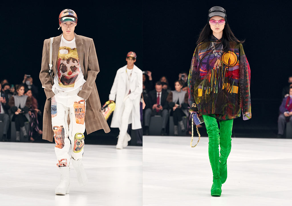The new collection draws upon Lopez’s liberated sensibility and Studio 54 surroundings. His gestural brushstrokes appear in elegant abstraction across cream kaftans and silken shirting; his figurative drawings translated into intarsia leathers, intricately engineered lace and shimmering jacquards. Fendi bags also become canvases for Lopez’s art, from a Baguette tapestry woven into a rainbow to a Peekaboo transformed into a graphic work.