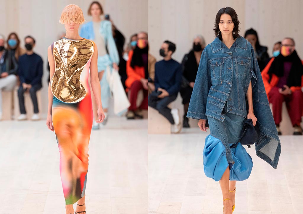The line is vertical. The body is twisted, turned, contorted. Long dresses protrude in unexpected places, metal plates are integrated into coats and dresses, drawing an altered body, augmenting the reality of dressing into another dimension. Capes like wings define erotic manga characters, while draped elements hang, fall, turn all over. Denim, too, is treated in sculptural ways, while sequins and flounces are a moment of shimmer and flutter.