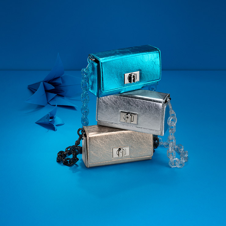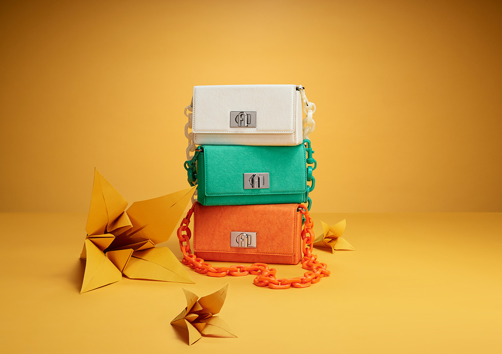 Origami is the unmistakable inspiration for this colorful collection. Made of a special paper-like fabric, the bag has a foldable and extendable box construction that reinterprets the iconic Furla 1927 bag in the spirit of a blossoming flower.