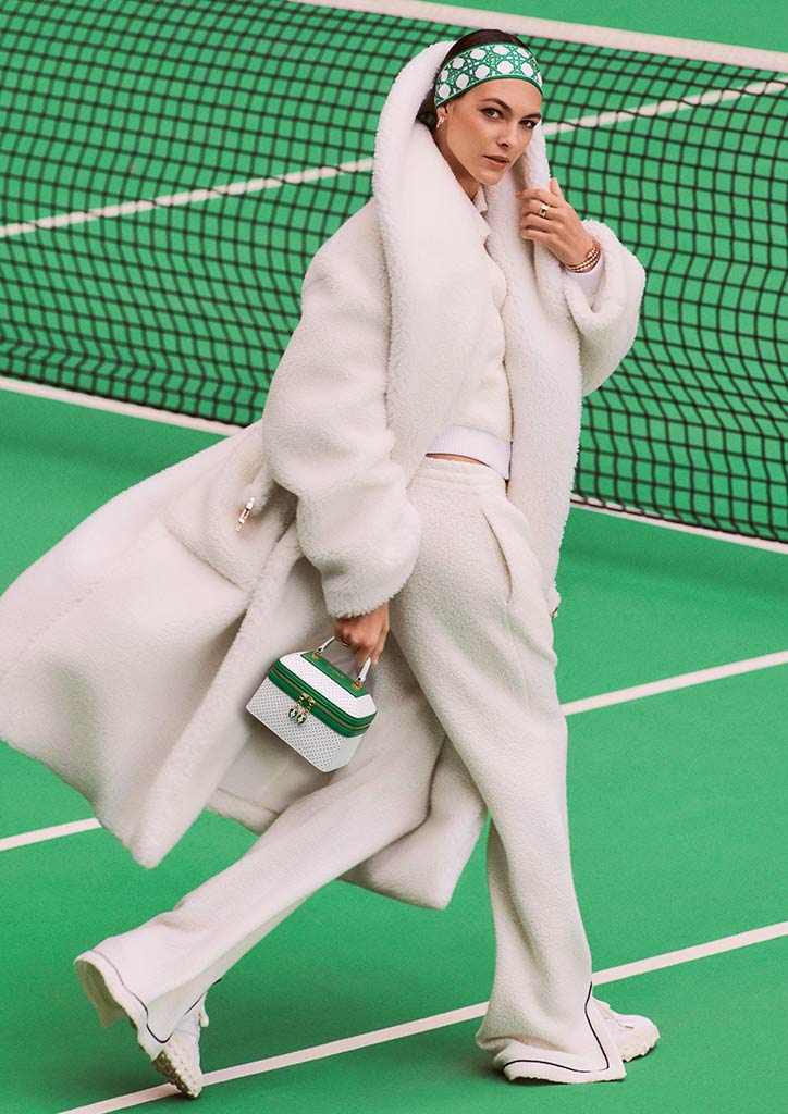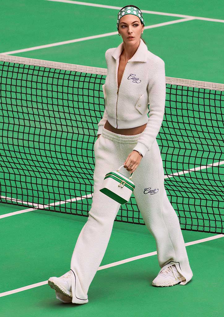 Inspired by classic tennis styles and graphic design elements, Casablanca elevates après sport looks for the first look, playing on the iconic contrast between a white background and green accents. The unique mix of white perforated leather, gold plated hardware and unprecedented wood handles immediately refers to the equipment, the mood, colors, details, the looks and the elegant aesthetics from the tennis world.