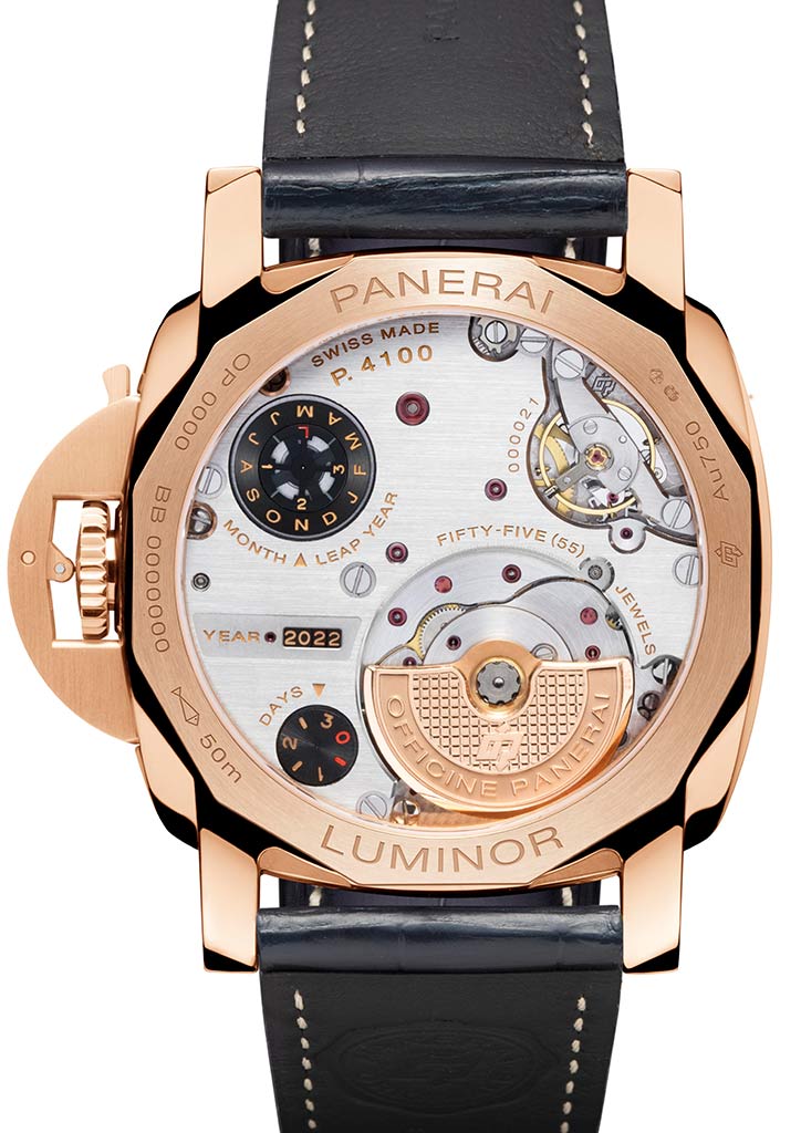 The automatic movement P.4100, created by Panerai, animates the Luminor Goldtech Calendario Perpetuo. The movement offers intuitive setting that requires no corrector or tools, permitting adjustments to the day, date, month and year through rotating the crown in either direction.