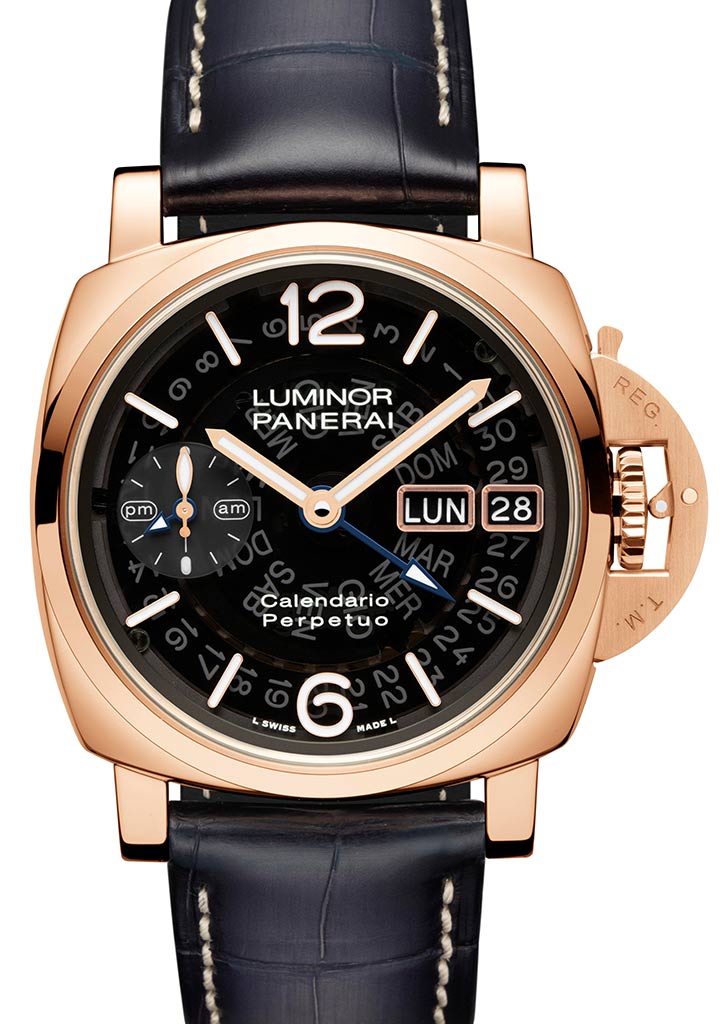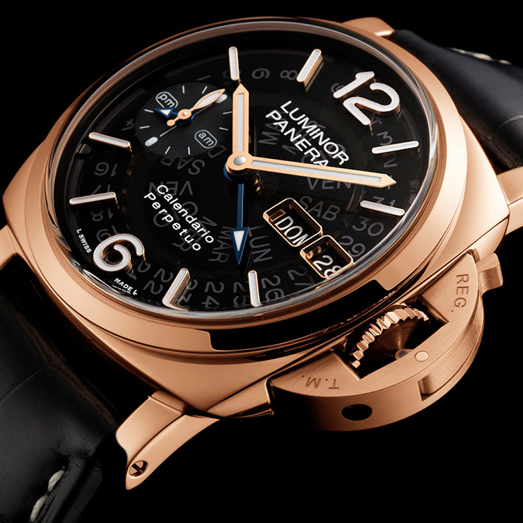 Waterresistant up to 5 bar (about 50 meters deep), the Calendario Perpetuo features a trapezoidal pin buckle in Panerai Goldtech. A screwdriver to remove the buckle accompanies the watch together with a black rubber second strap.