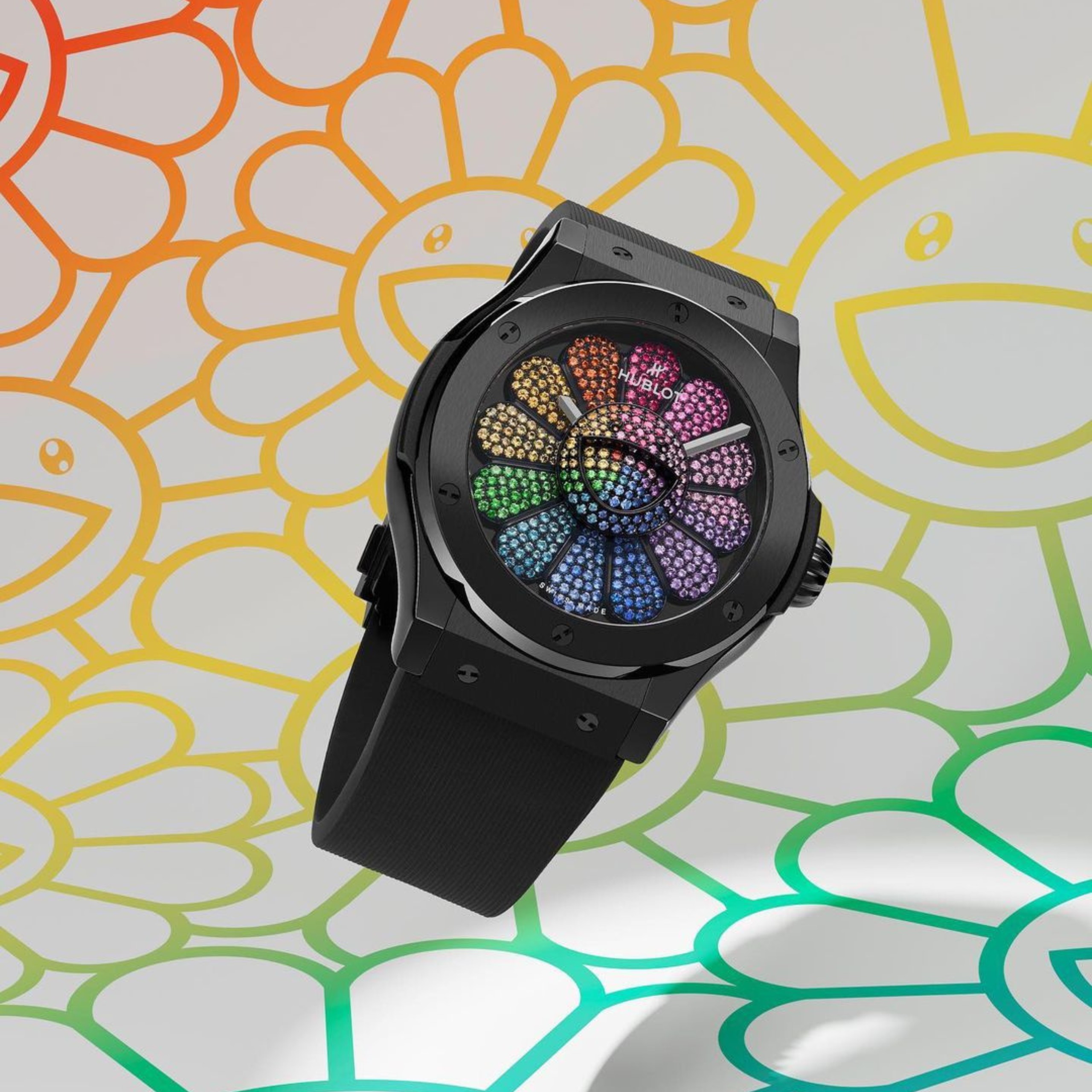 Hublot’s collaboration with Takashi Murakami was first announced in 2021, creating watches designed with Murakami’s “Smiling Flower” motif.