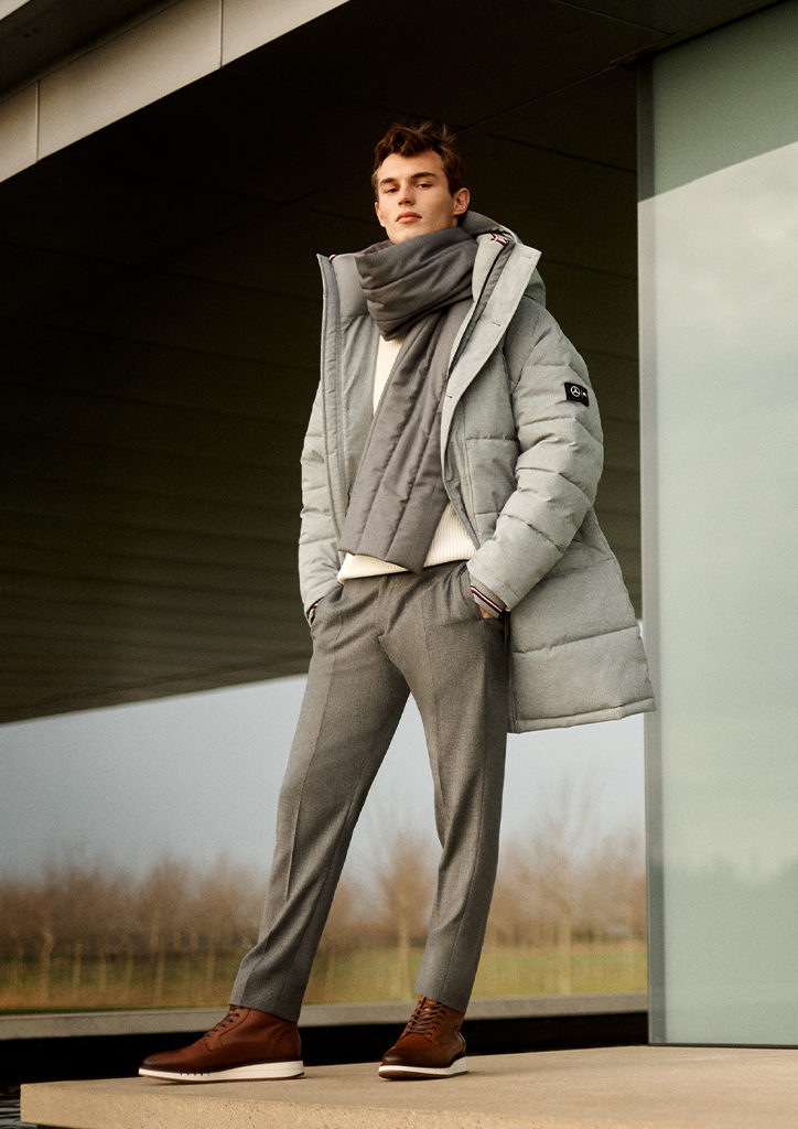 The latest collection of the TommyXMercedes-Benz line includes classic pieces, fantastic additions to any gentleman’s refined wardrobe. Elevated items such as the utility jacket, the bomber jacket, and the leather jacket feature tailored details and technical elements. These include climate control finishes, perforations, rubberized tapes, seamed seals, and Velcro® adjustable closures. Combining two palettes, Tommy Hilfiger’s iconic Americana colors are enriched with burnt orange, light grays, and olives. The collection exhibits both logos of the two brands through subtle and elegant executions. Through a minimalist approach, the Tommy Hilfiger stripe continues on hems and cuffs while the linings of the Mercedes-AMG Petronas Formula One Tri Star are evident on outerwear. Overall, the collaboration succeeds in creating clean and sophisticated looks for the modern Tommy Hilfiger man.
