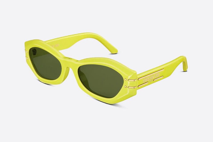 Consider a neon-colored frame that plays on curves for sunnies that pop. If you’re cautious about going with a bold choice without trying them on, Dior offers a “try online” feature. It requires access to your device’s camera, then the eyewear you want to fit pops on your face like an Instagram filter.