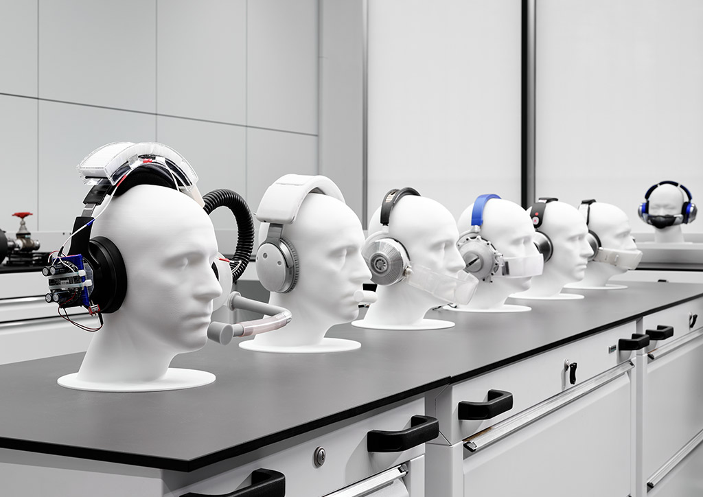 More than 500 prototypes saw one motor initially placed at the nape become two compressors, one in each ear-cup and the evolution of the snorkel mouthpiece into an effective, contact-free visor that delivers clean air without full-face contact—a brand-new clean air delivery mechanism.