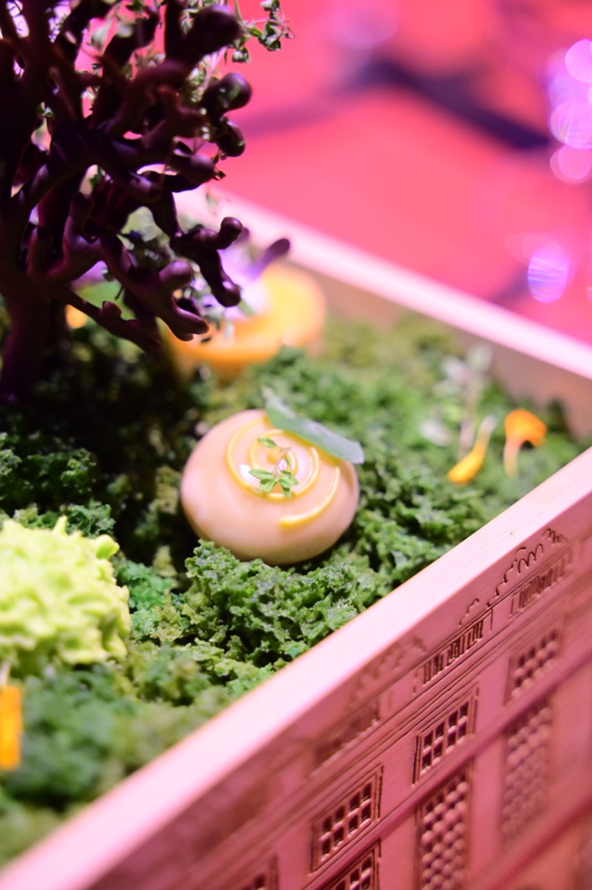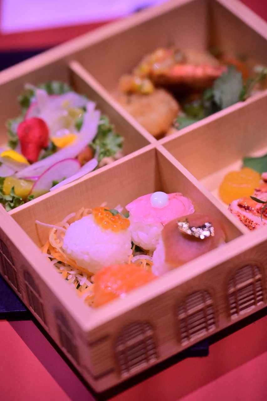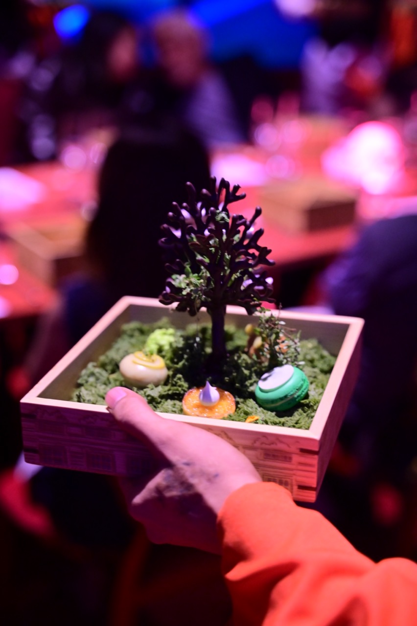 A close up of the sweet garden; Guests were served their meal on a three-layer bento box; Souvenirs to end the journey on the Faubourg Express; The final floor of the Faubourg bento is the garden on the rooftop; The first course was inspired by the Sunrise on Honoré Valley
