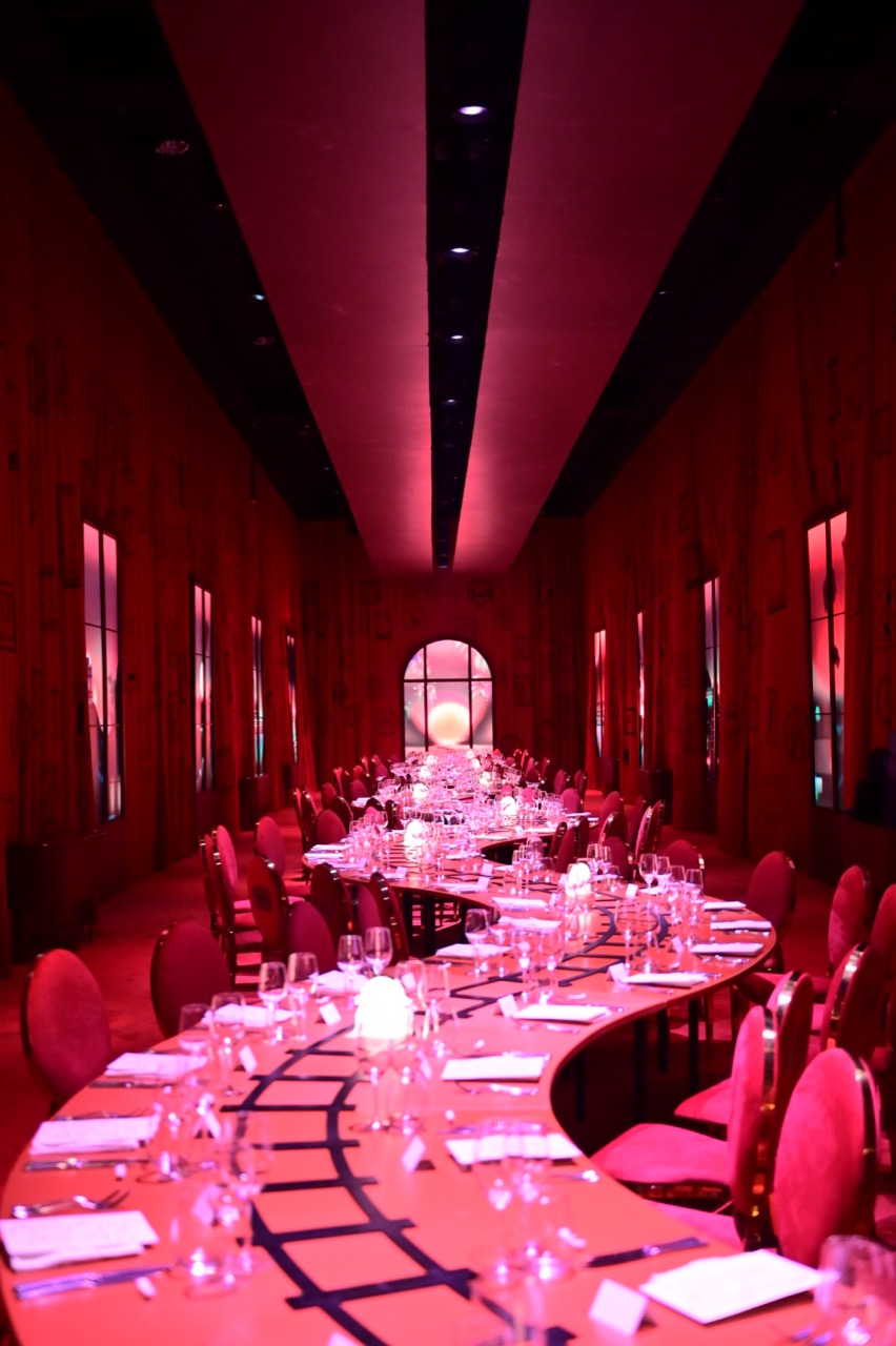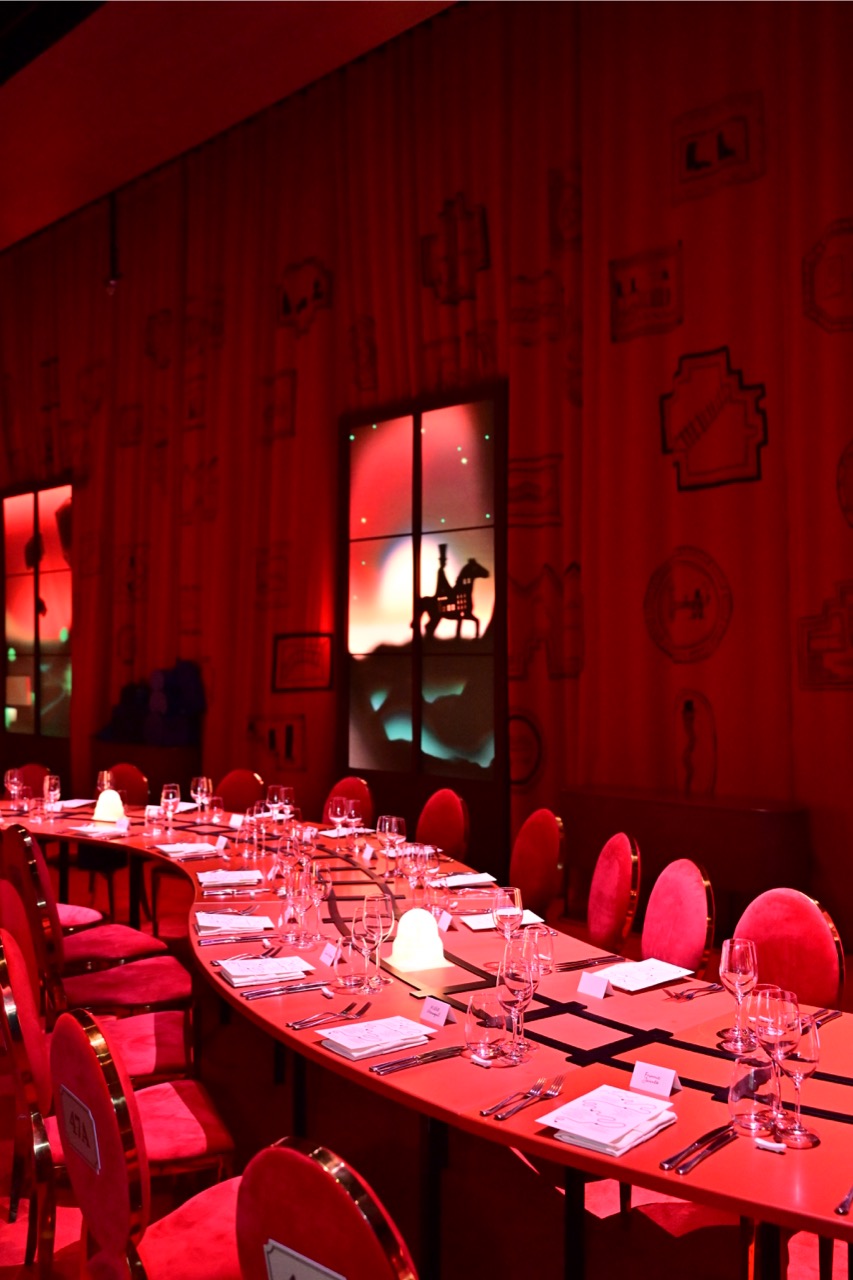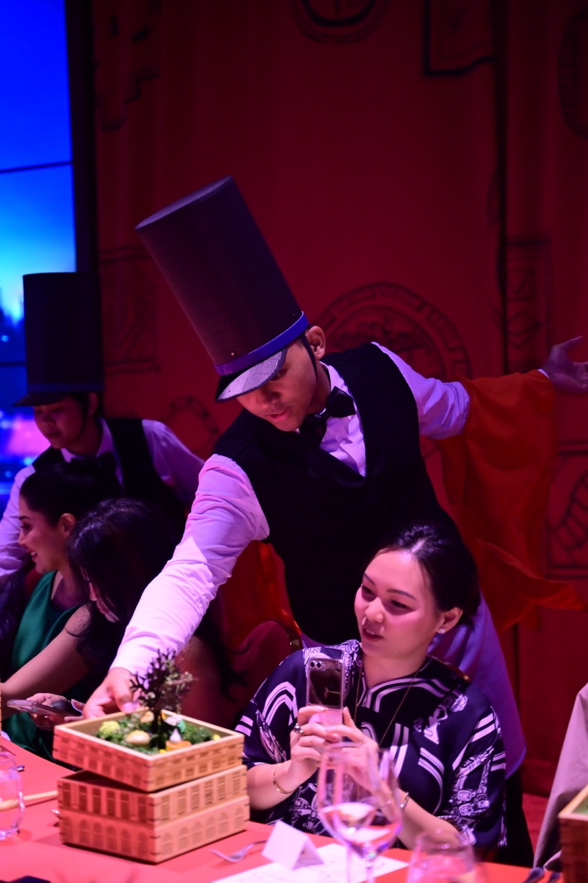 On board, smartly garbed stewards—in classic French waiter uniforms cleverly combined with train conductor hats—guided us through the “train” setting, where elongated arched windows displayed the landscape in motion. We were invited to take our seats and to embark on a night of adventure and whimsy, with a culinary feast designed to complement each intriguing destination.