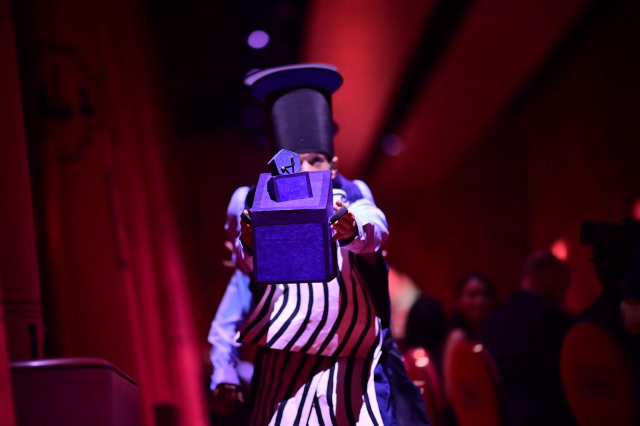The immersive train ride narrative reached its denouement as the mysterious train conductor, whose voice was heard throughout the evening announcing stops and stages of the journey with a suitably French accent, finally made an appearance. The train conductor’s deep and mesmerizing voice captivated the room as he led a resounding song to close the night.