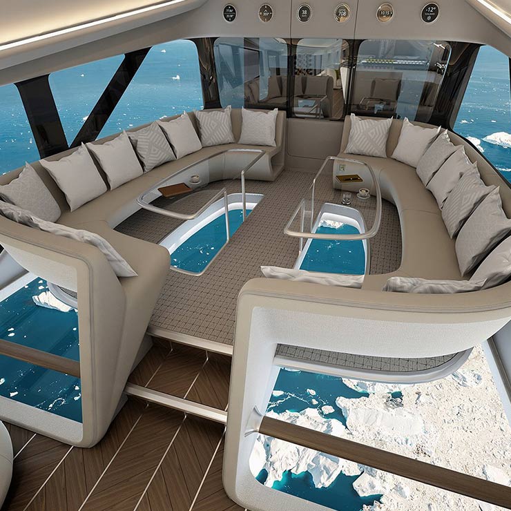 Unlike Swan, though, the 16 passengers who can occupy the eight double cabins can experience the Arctic in total comfort. There’s an infinity lounge that allows passengers to enjoy horizon-to-horizon views.