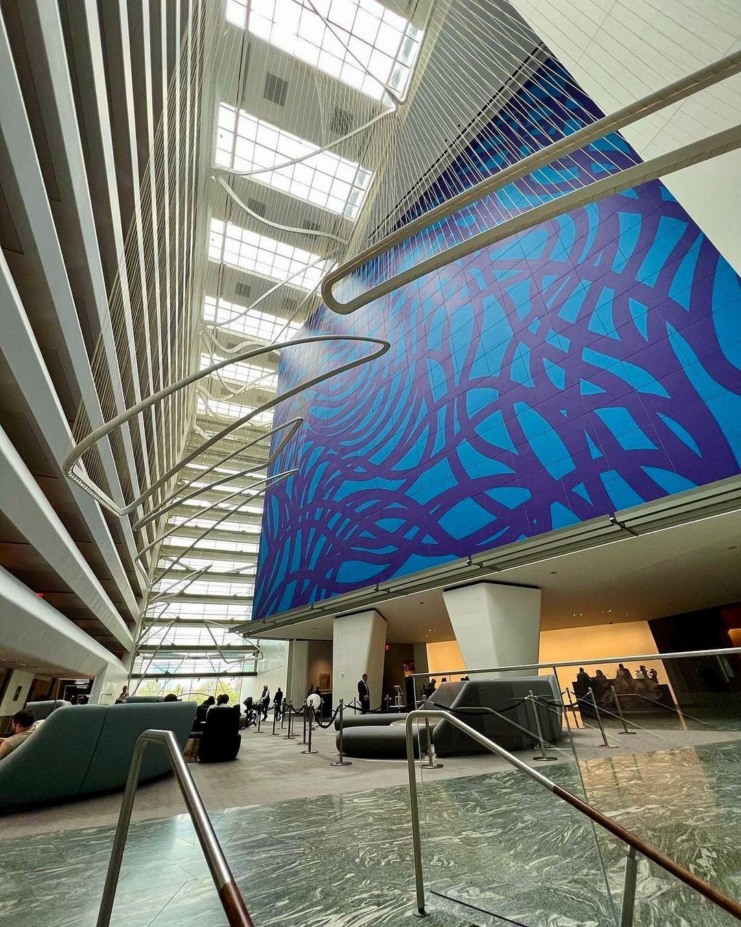 As soon as guests enter The Conrad in downtown New York, they’re immediately greeted by a Sol LeWitt painting, “Loopy Doopy (Blue and Purple),” rising 13 stories above the atrium level. The giant painting took more than 3,000 hours to create and required more than 100 gallons of paint.