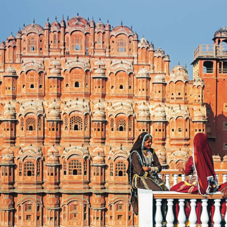 Banner: The five-story exterior of Hawa Mahal is made up of 953 small windows called Jharokhas /