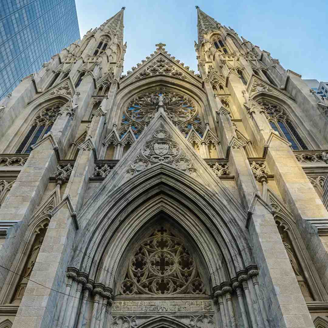 St. Patrick’s Cathedral is a Neo-Gothic cathedral with landmark status in New York City. It features titanic bronze doors, a high altar, and thousands of stained glass windows.