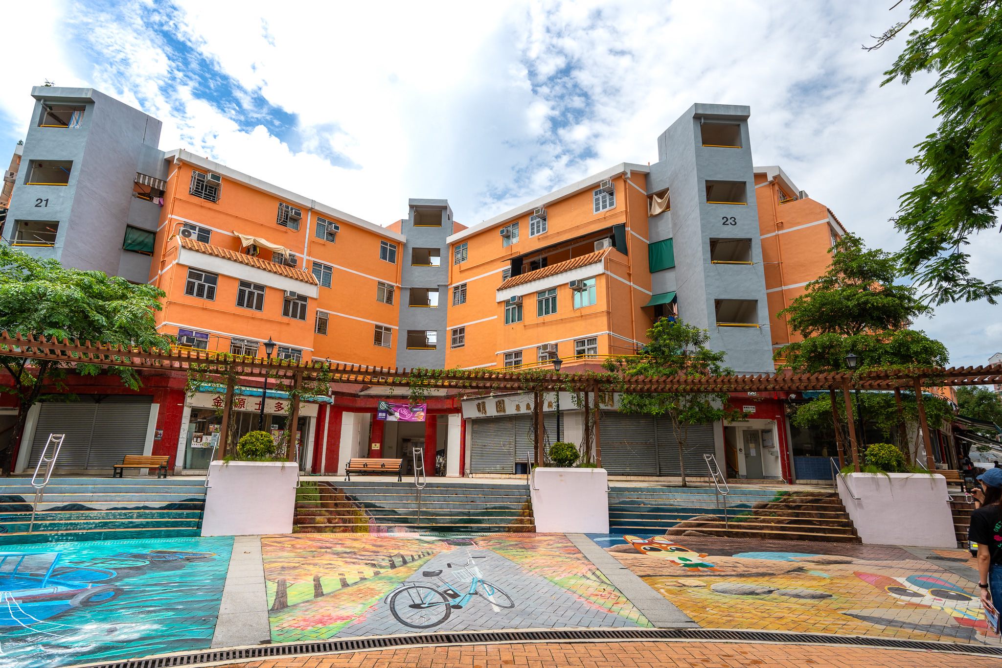 The Sha Tau Kok Chuen was created to give homes to the indigenous residents of Yim Liu Ha and Tsoi Yuen Kok, who were impacted by the informal settler clearances. The development covers 35,000 square meters with 52 blocks and 802 flats. While the original color palettes were muted tones, Ying Hoi House opted for a more unconventional design to infuse energy and style through vibrant colors. In 2020, older blocks of the estate underwent renovation and were repainted with brighter hues like purple, orange, pink, and apple green. Some were painted in pastel orange with horizontal stripes seemingly mimicking salmon fillets, thus the monicker, “Salmon House.”