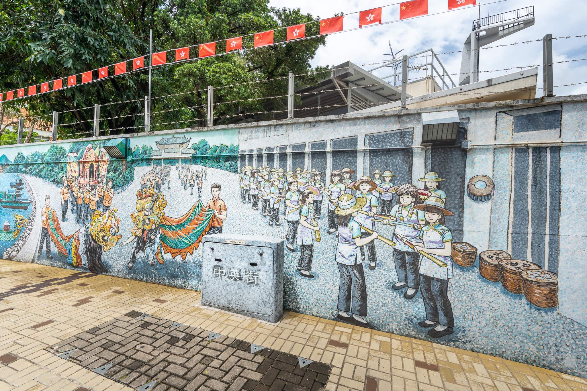 Two murals depict the deity-thanking ceremony, which is a traditional cultural event. Even today, residents celebrate the Tin Hau Festival every year, with a grand ceremony that is celebrated every decade. This mural shows one of the most distinctive celebrations, Hoklo women performing the dragon boat dance.